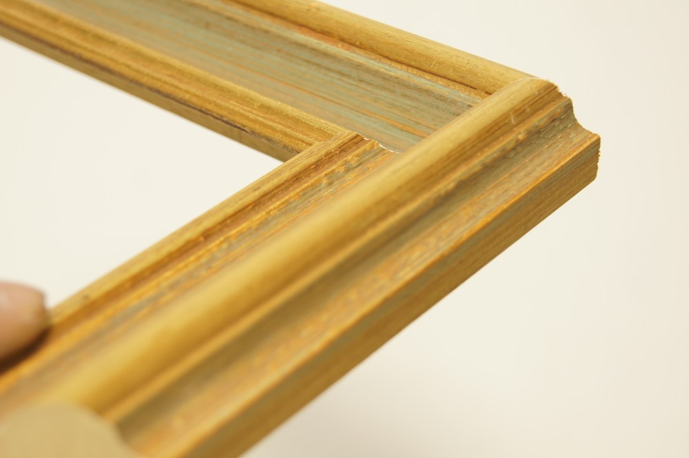 内側が大きくえぐれた形状のフレーム。手彩色で塗り重ねられた色は擦り出され、複雑な色合いを作り出しています。