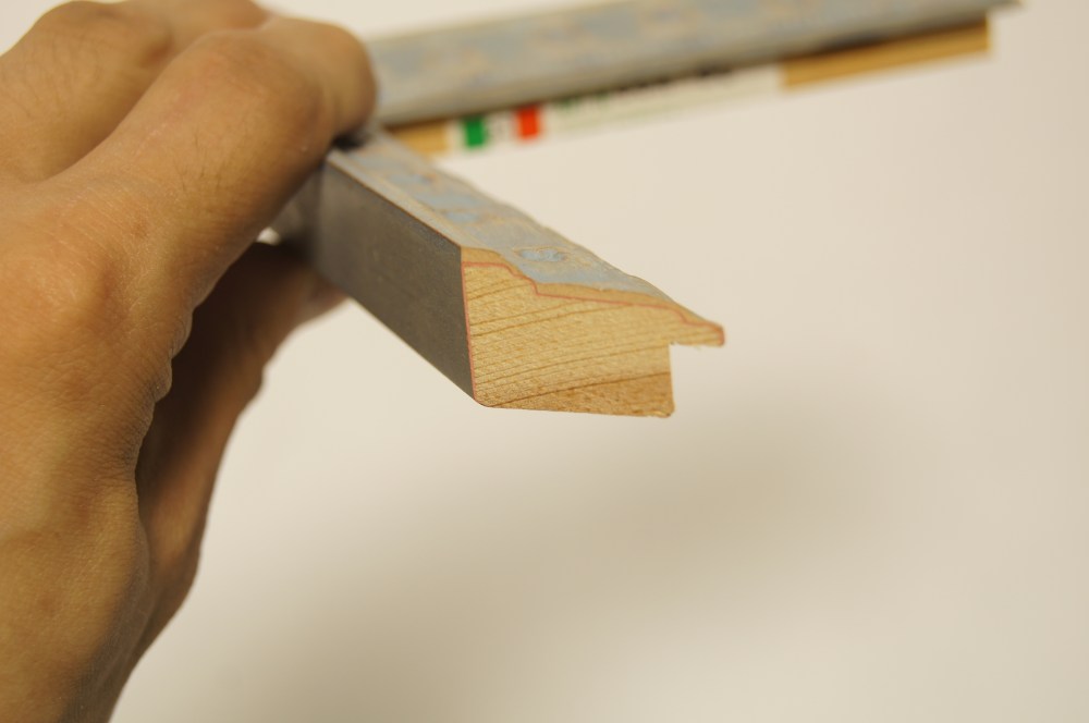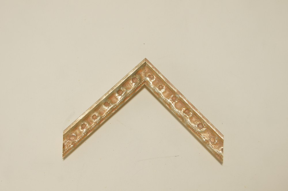 シルバーの下地にカラーの汚しをかけて、それを擦りだしたフレーム。擦りだしたシルバーと抑えめなカラーが不思議となじみます。規則的なような不規則なような丸い模様もアクセントになっています。